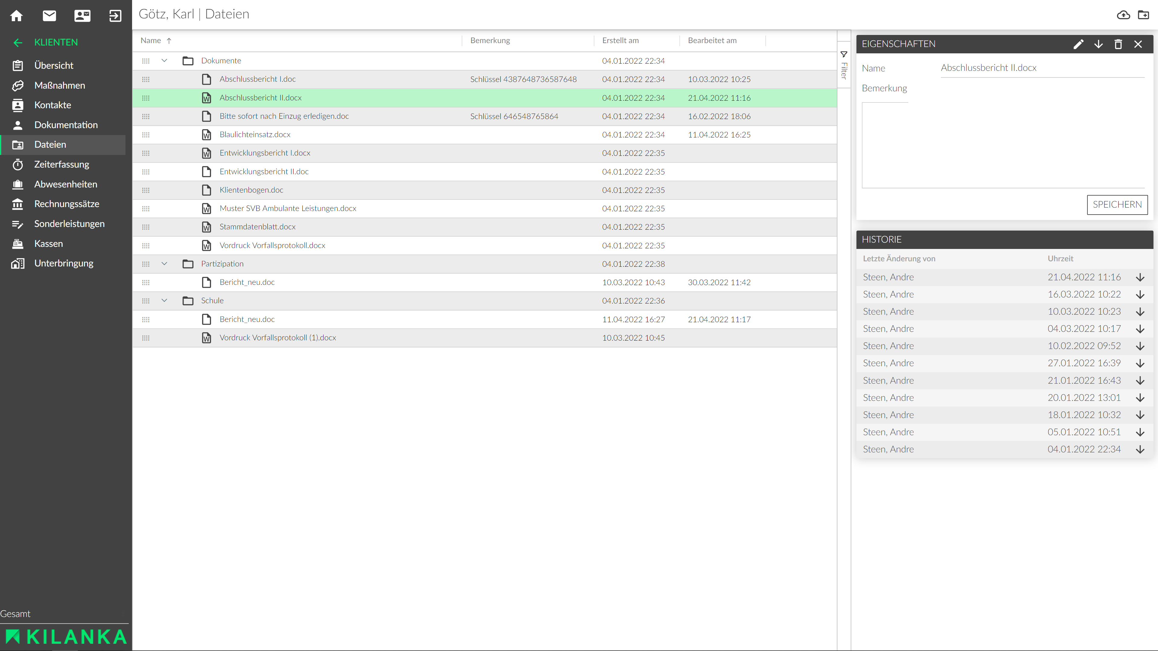 Zentraler Speicherort klientenrelevanter Dokumente wie z. B. Kostenzusagen, Zeugnisse oder auch Entwicklungsberichte.