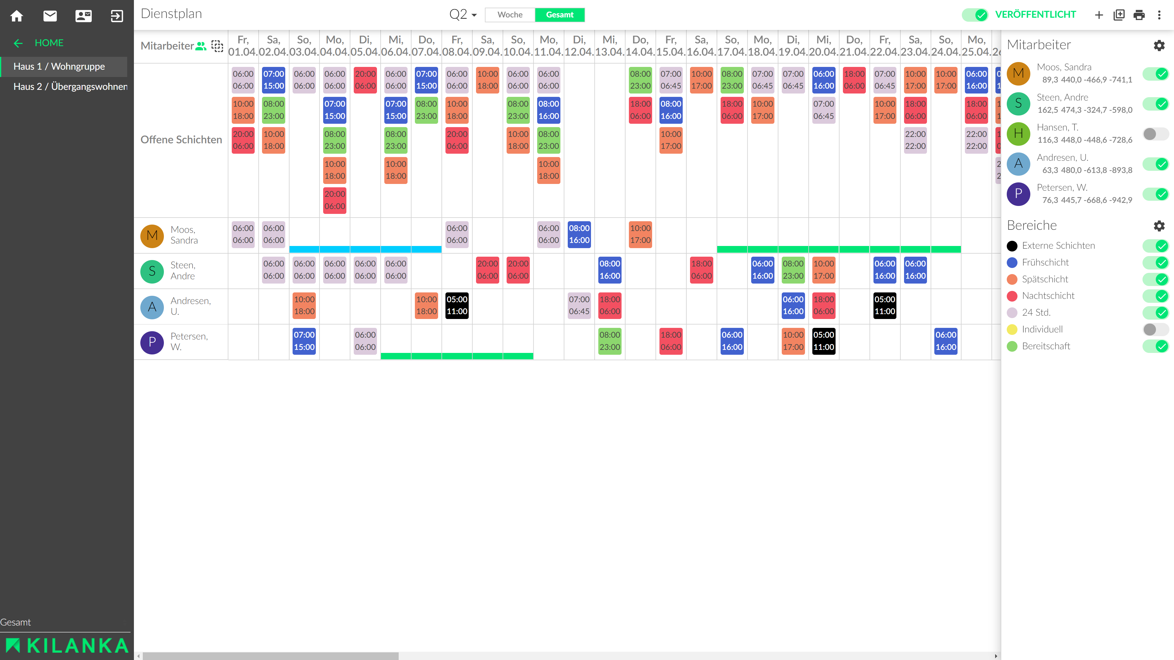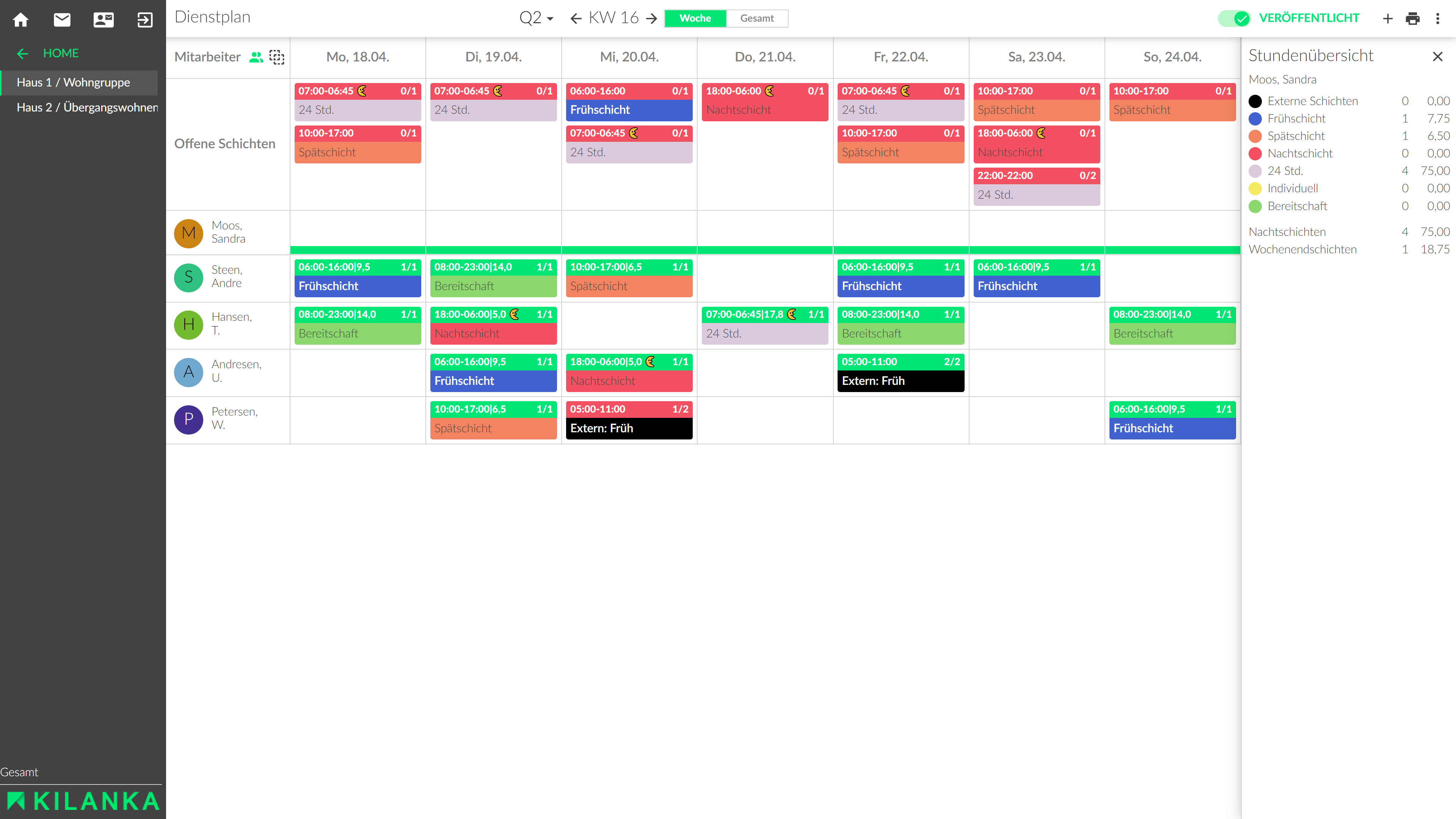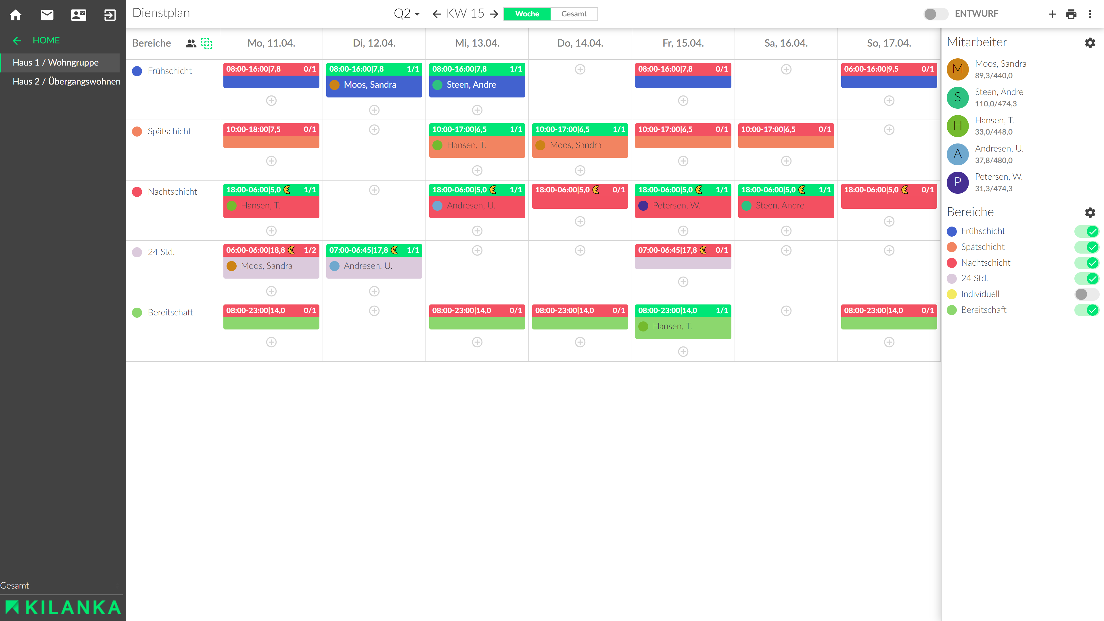 Die Rote Kopfzeile in den Schichten signalisiert eine Unterbelegung, die durch Krankheit oder unvollständige Planung besteht. Eine grüne zeigt eine konfliktfreie und abgeschlossene Planung an.