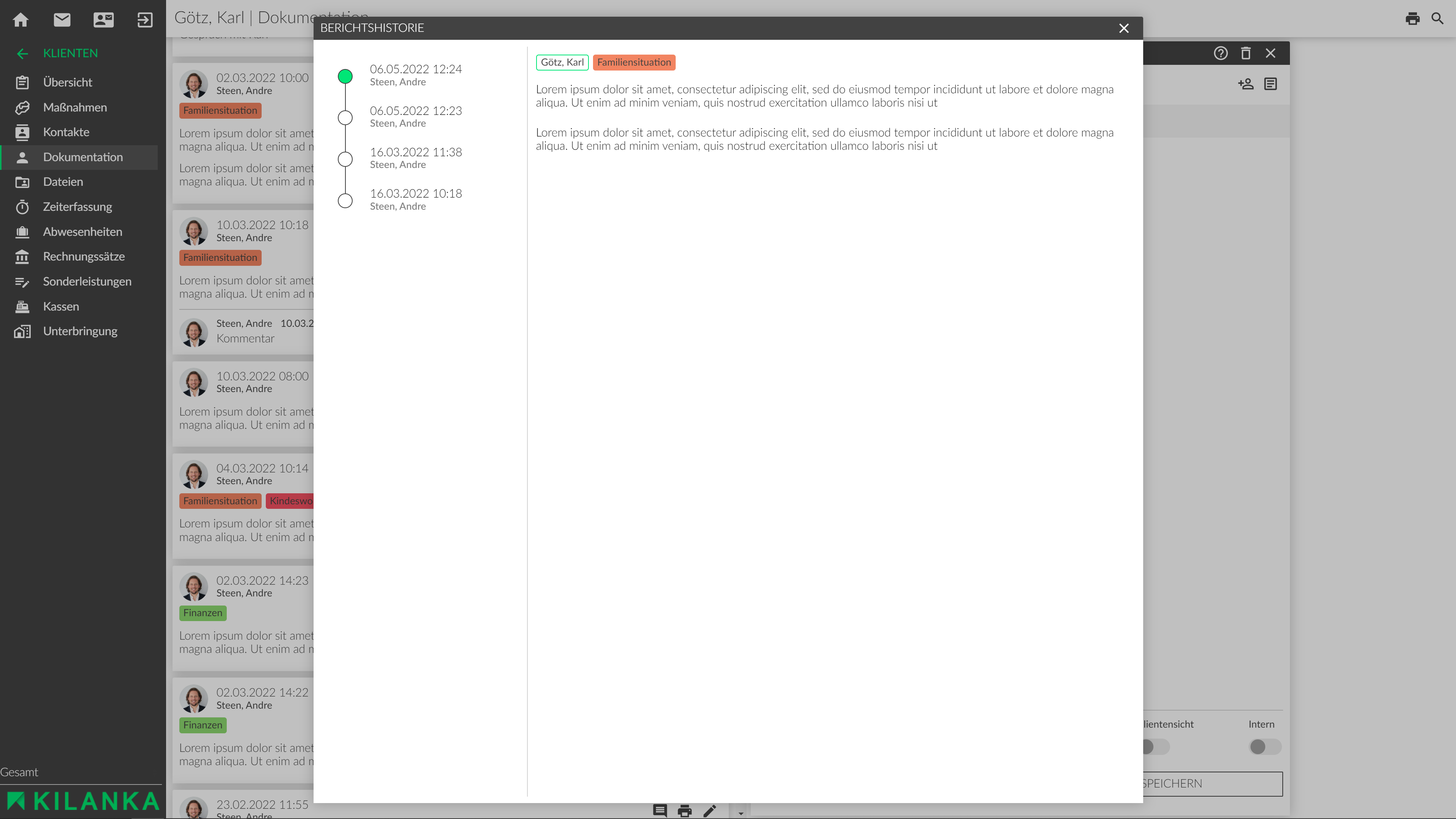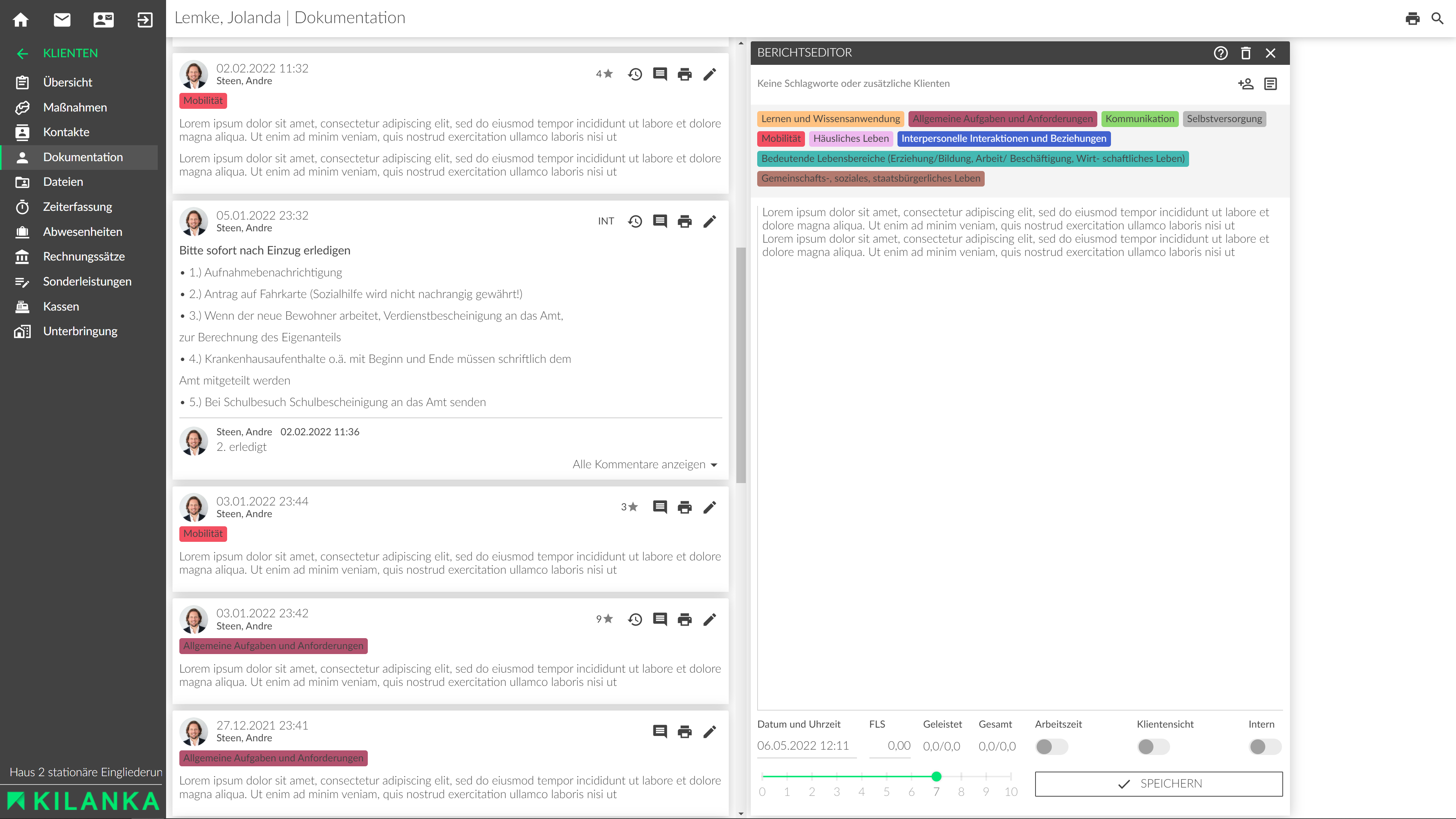 Neben Ihren textlichen Ausfertigungen bietet die Dokumentation in Kilanka auch die Möglichkeit weitere Daten zu erfassen. So lassen sich für jeden Bericht Schlagworte vergeben, um ihn so zu klassifizieren. Der gesamte Dokumentationsverlauf kann nach diesen Schlagworten gefiltert werden, um einen größeren Überblick zu bekommen. Auch weitere Klienten lassen sich jedem Eintrag zuordnen.