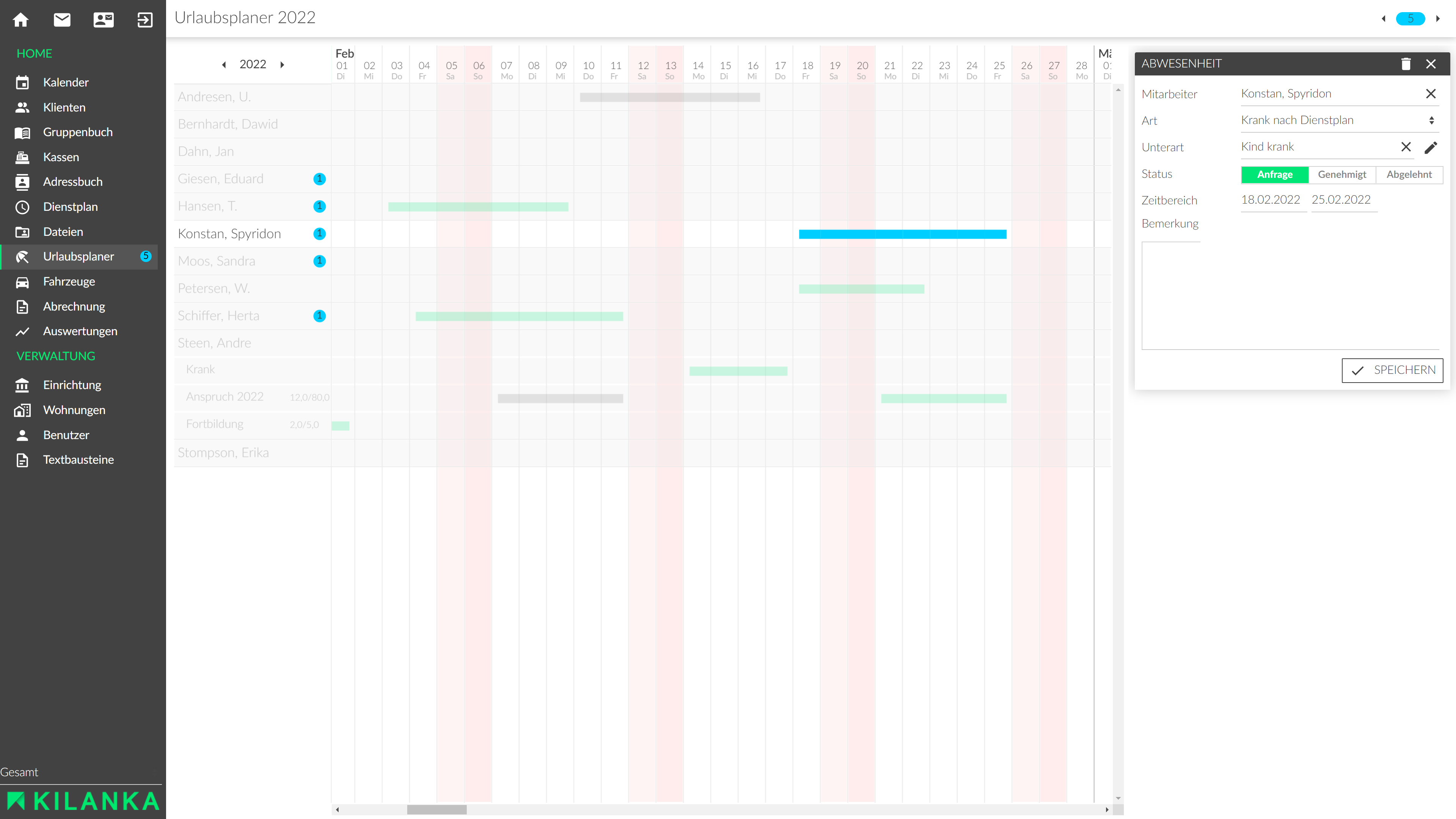 Es sind beliebige Urlaubskontingente möglich, z. B. Jahresurlaub und Fortbildung. Neue Abwesenheiten können bequem per Maus im persönlichen Bereich eingetragen werden.