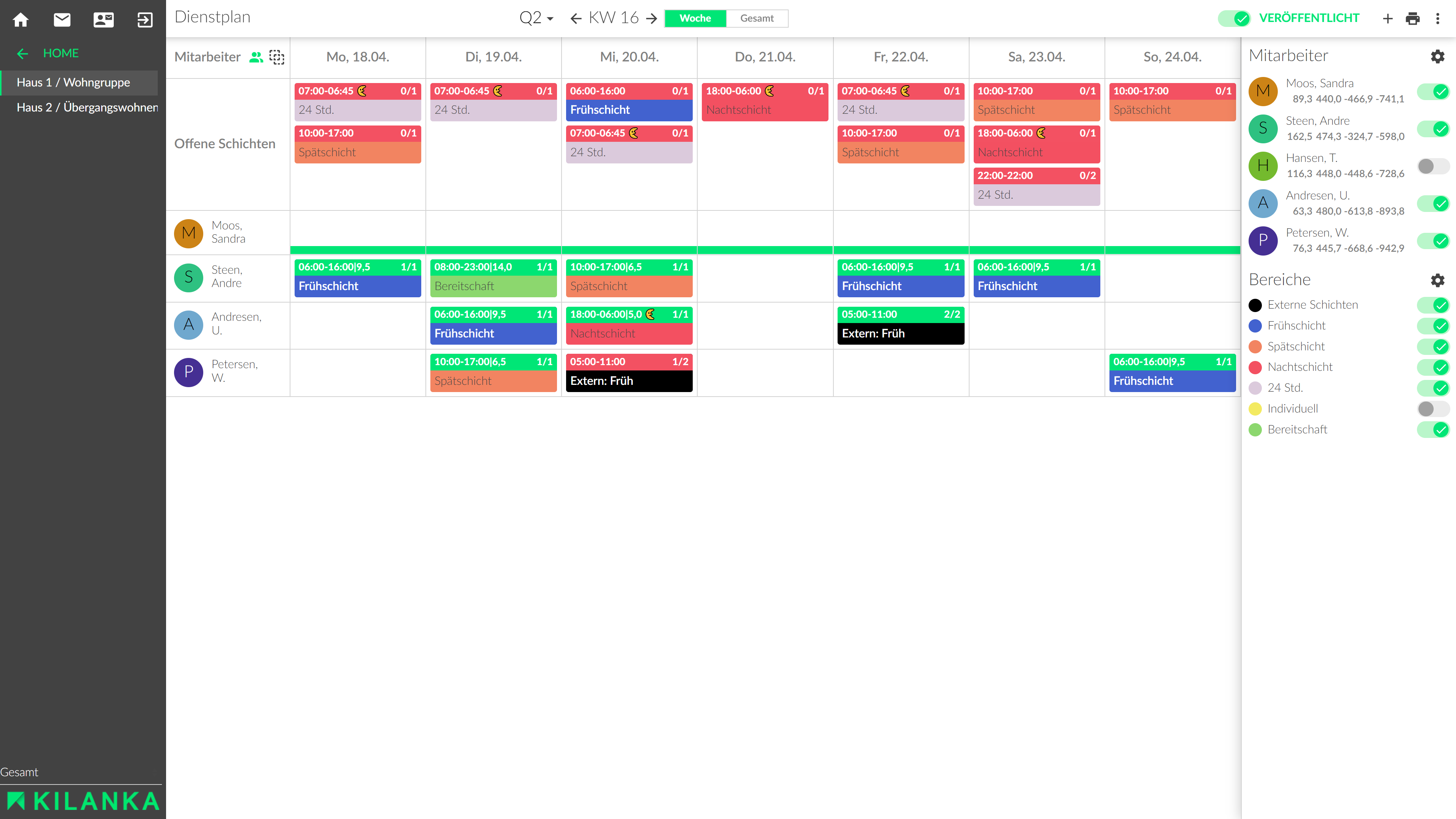 Die Rote Kopfzeile in den Schichten signalisiert eine Unterbelegung, die durch Krankheit oder unvollständige Planung besteht. Eine grüne zeigt eine konfliktfreie und abgeschlossene Planung an.