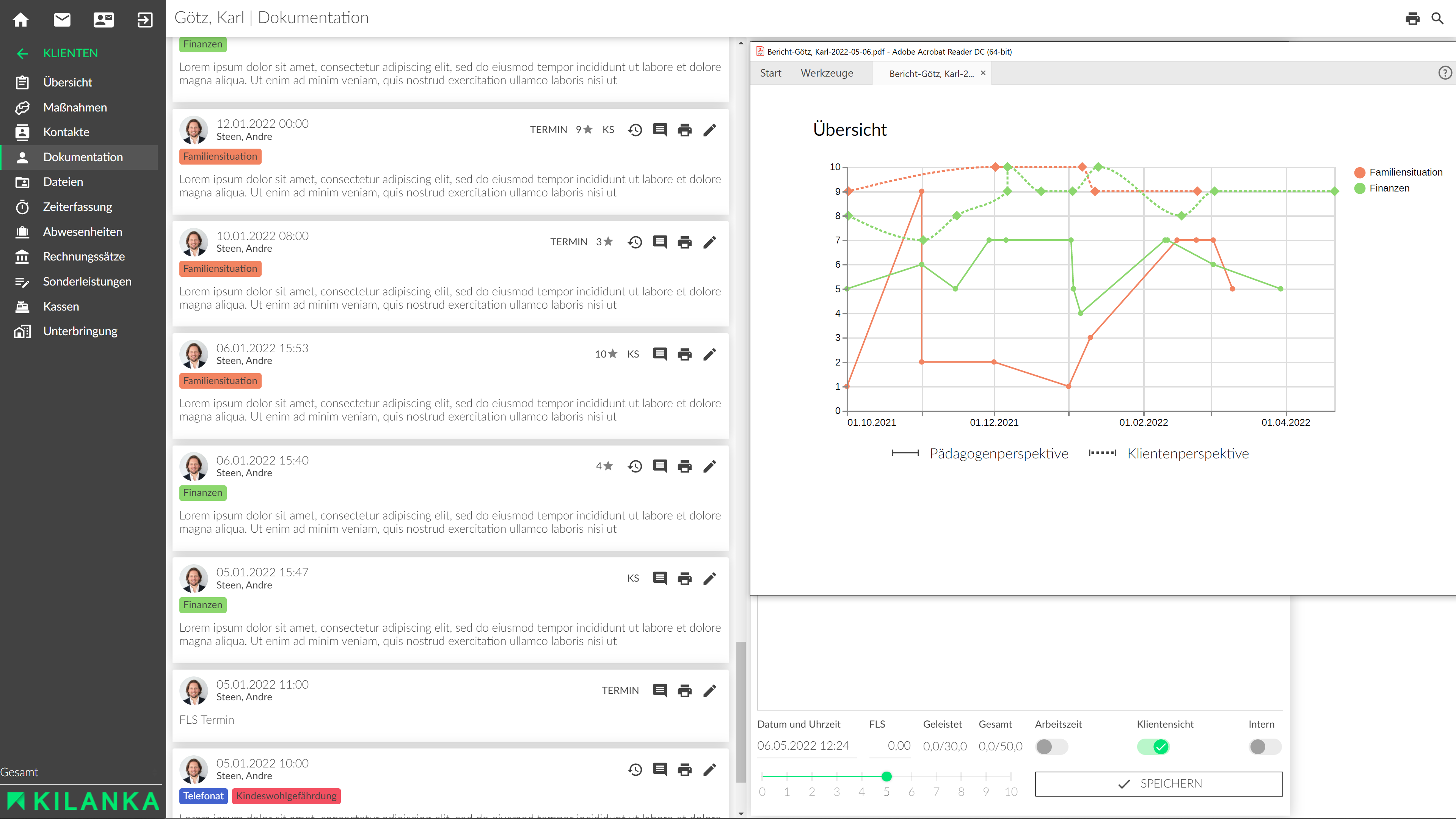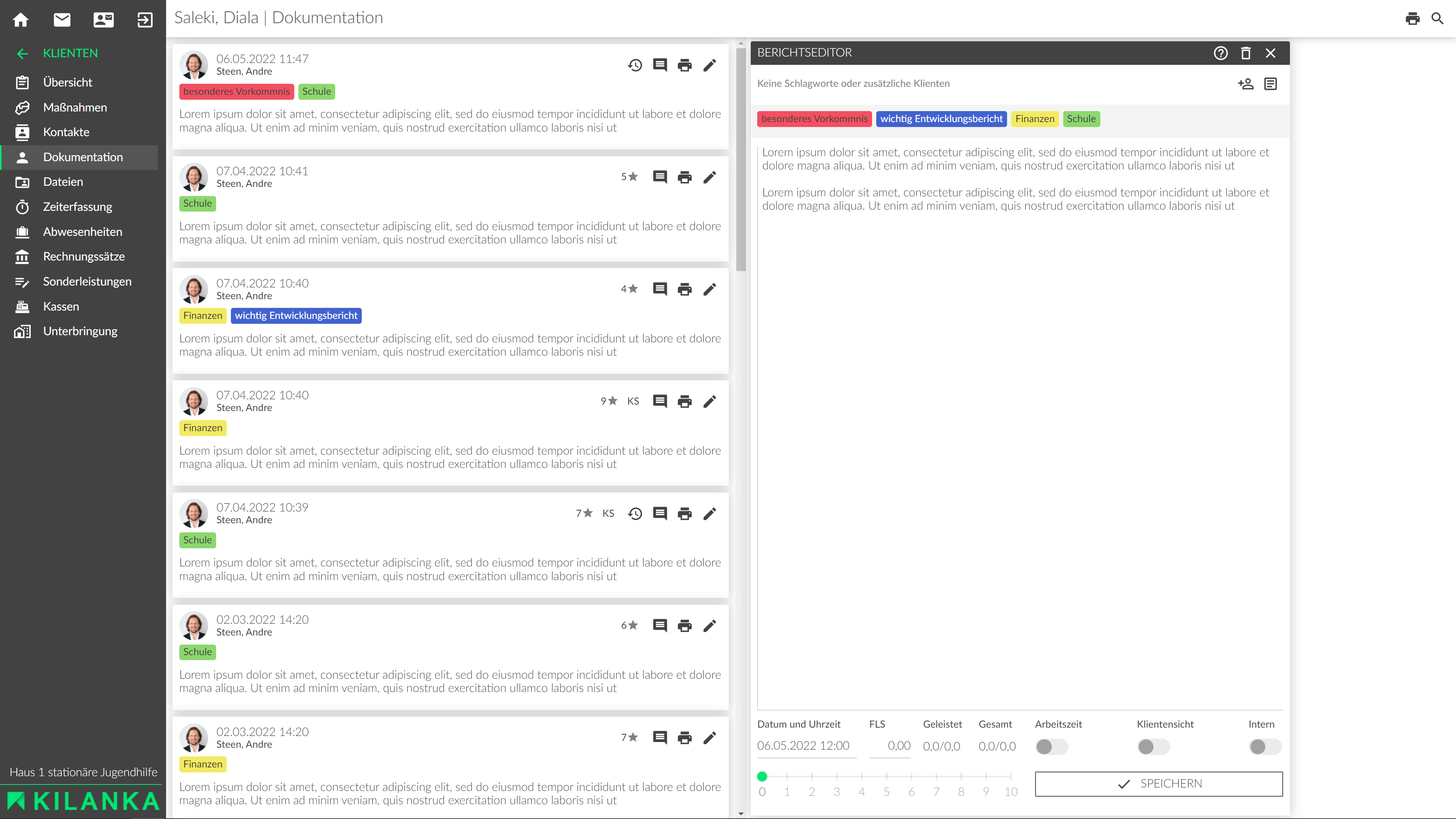 Neben Ihren textlichen Ausfertigungen bietet die Dokumentation in Kilanka auch die Möglichkeit weitere Daten zu erfassen. So lassen sich für jeden Bericht Schlagworte vergeben, um ihn so zu klassifizieren. Der gesamte Dokumentationsverlauf kann nach diesen Schlagworten gefiltert werden, um einen größeren Überblick zu bekommen. Auch weitere Klienten lassen sich jedem Eintrag zuordnen.
