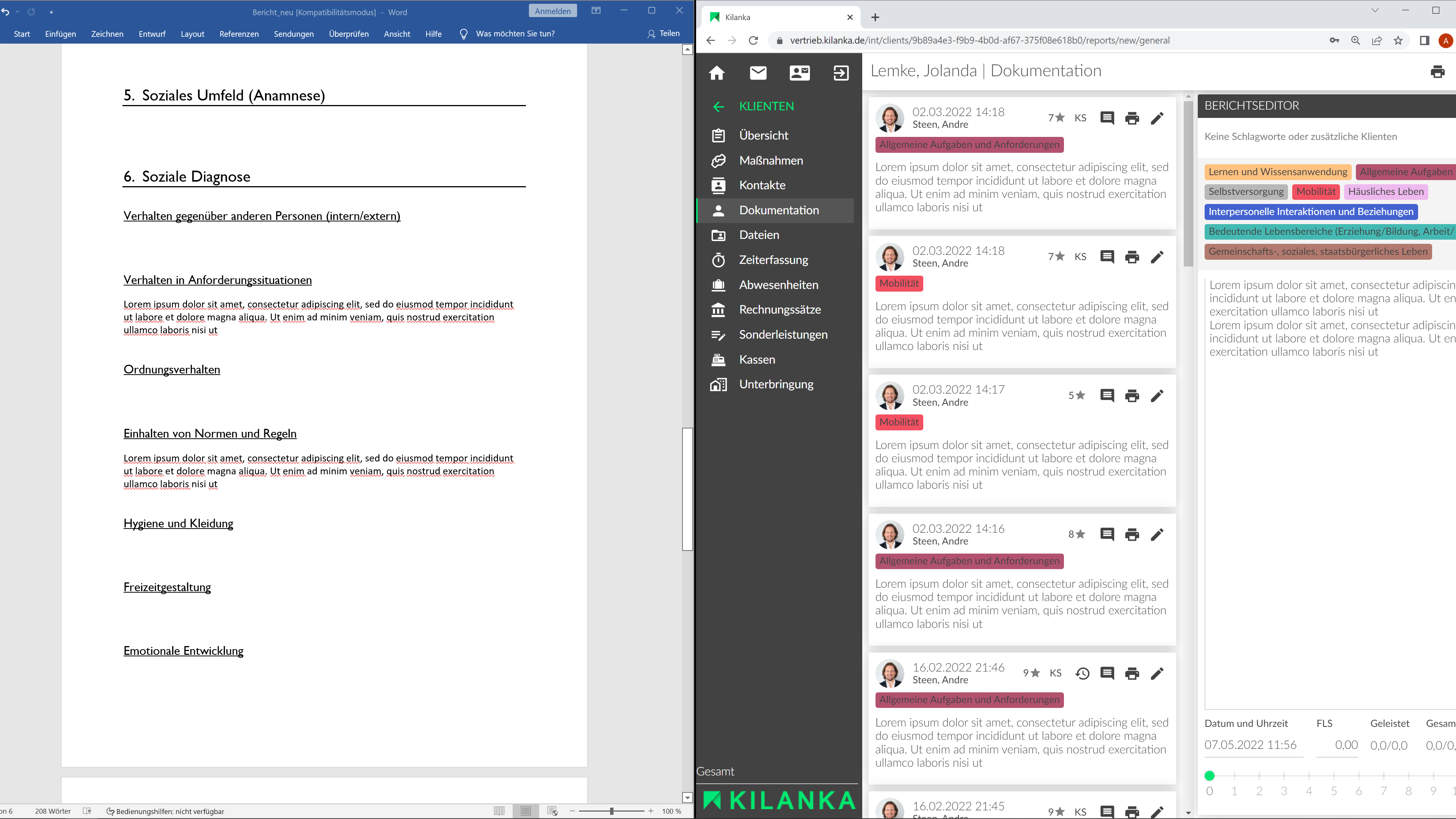 Mit Kilanka erstellen Sie die Dokumentation Ihrer Arbeit in einem übersichtlichen Editor. Das spezielle zweispaltige Layout bietet Ihnen dabei auch beim Verfassen ihrer Dokumentationen die Möglichkeit bereits hinterlegte Berichte einzusehen.