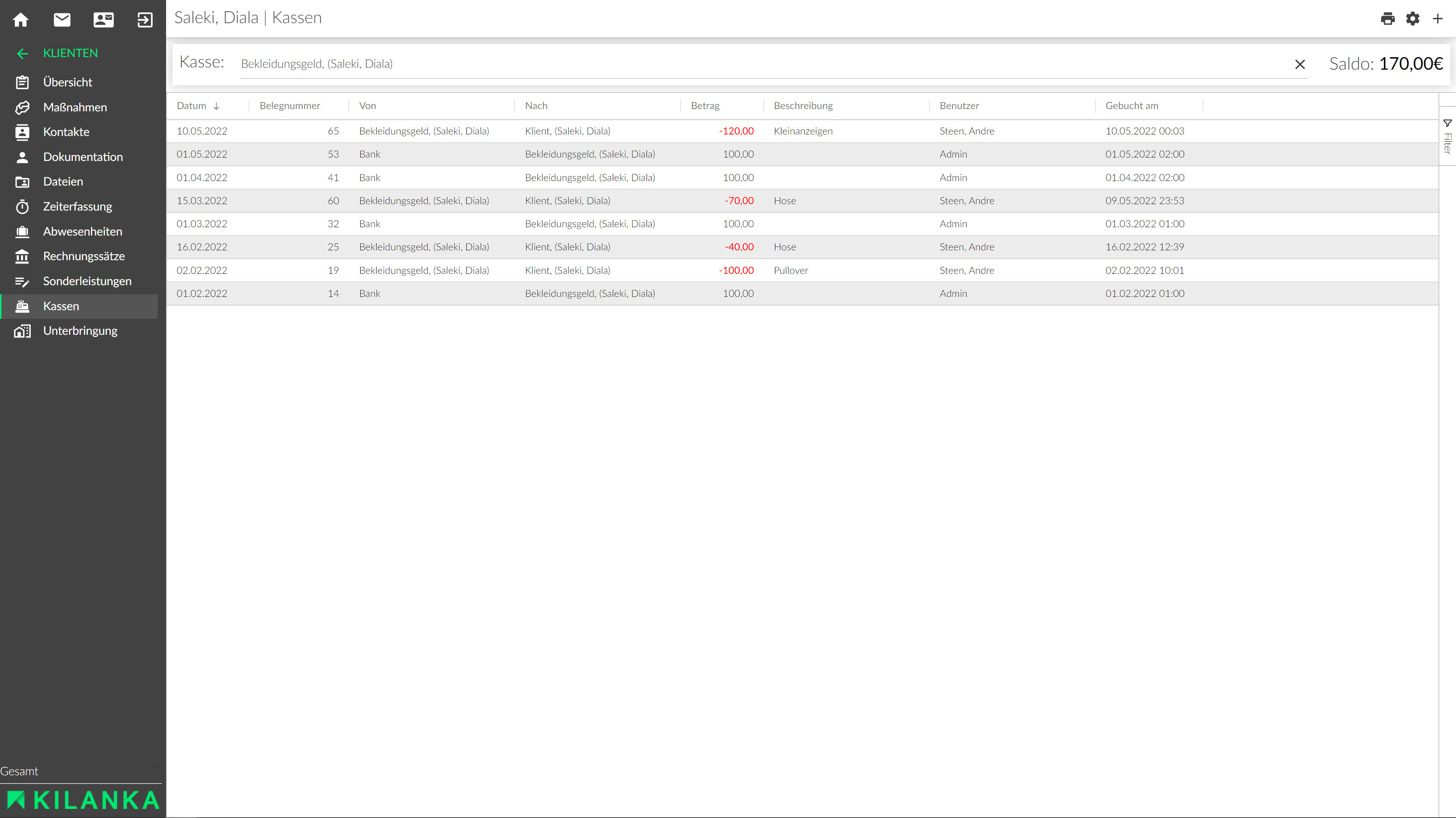 Erstellen Sie nach Ihren Anforderungen Kassenbücher für z. B. Taschengeld oder Bekleidungsgeld, sodass Sie jederzeit den Überblick über die finanzielle Situation Ihrer Klienten haben.