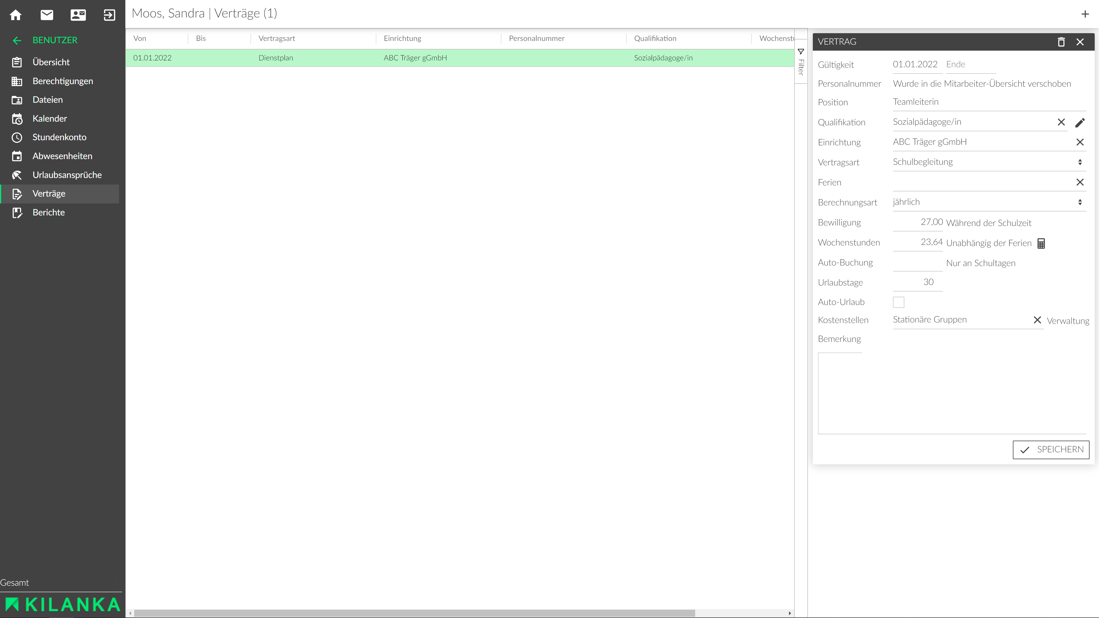 Hinterlegen Sie Mitarbeiterstammdaten wie dienstliche Rufnummern, Arbeitsverträge, tarifliche Zuschläge für den Dienstplan. Auch für die Schulbegleitung gibt es ein gesondertes Modell und Einstellungsmöglichkeiten zur Berechnung der Soll-Arbeitszeiten sowie Ferienzeiten.